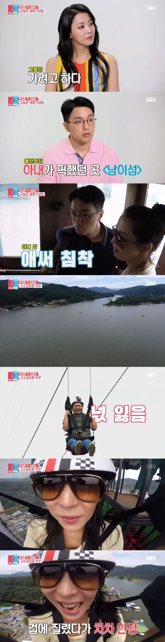남이섬에 도착한 두 사람은 제일 먼저 짚와이어를 타러 갔다. 무려 80m에 달하는 높이를 본 한고은과 신영수는 시속 80km로 달리는 어드벤처 코스 대신 시속 40km로 달리는 패밀리 코스를 선택했다.