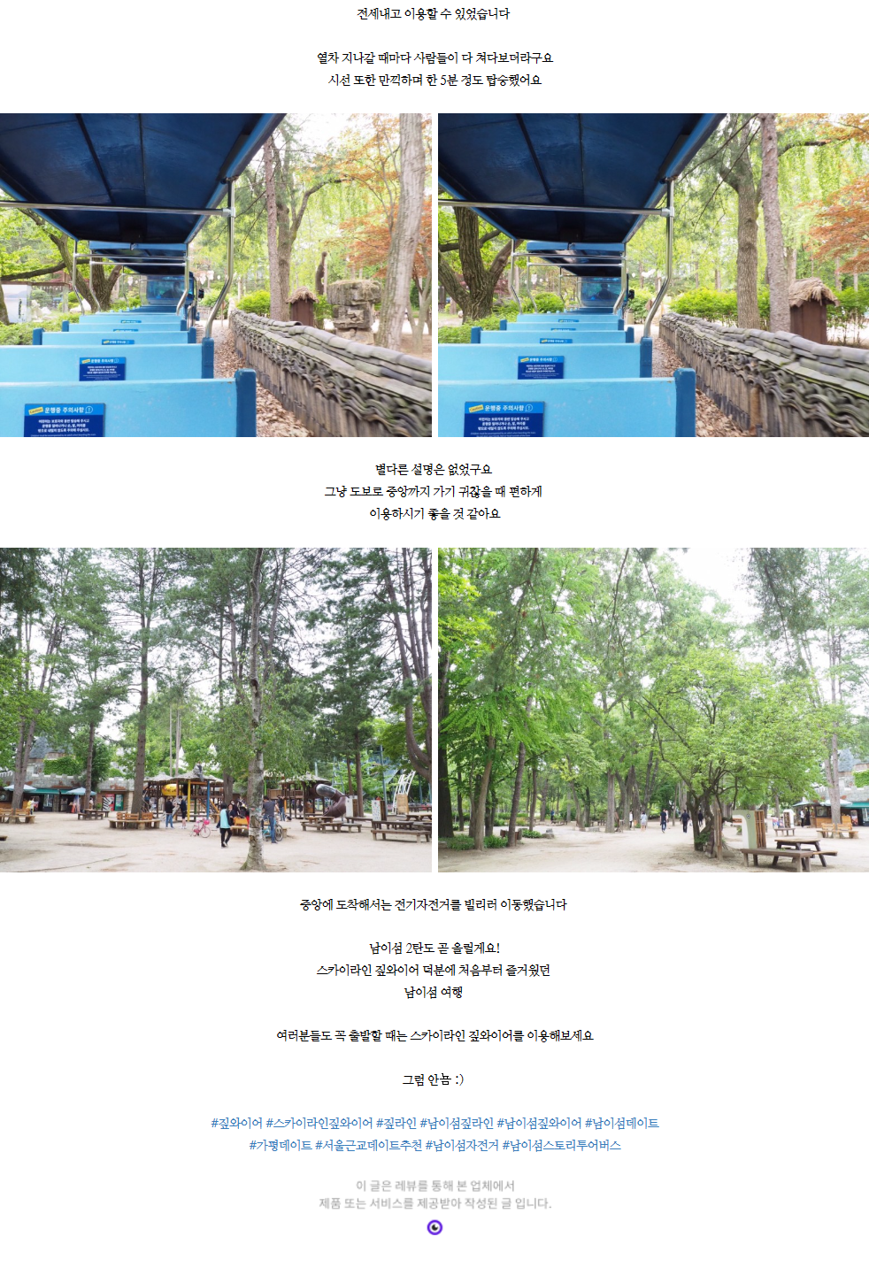 | 서울 근교 여행 남이섬 여행 일정 공유해요 ~ !!! 남이섬 짚와이어 타고 온 후기 ( 스토리투어버스, 유니쉐프열차,전기자전거, 하늘자전거 꼭 타야할까? ) | |